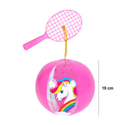 * Caractéristiques produit : - Coloris : Transparent/rose - Thème licorne féérique - Avec raquette - Diamètre ballon : 19cm - A gonfler - Matière : PVC