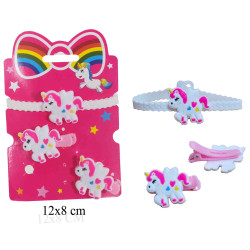 * Caractéristiques produit: - Set composé de deux pinces à cheveux et d'un bracelet - Décor licorne - Présenté sur carte